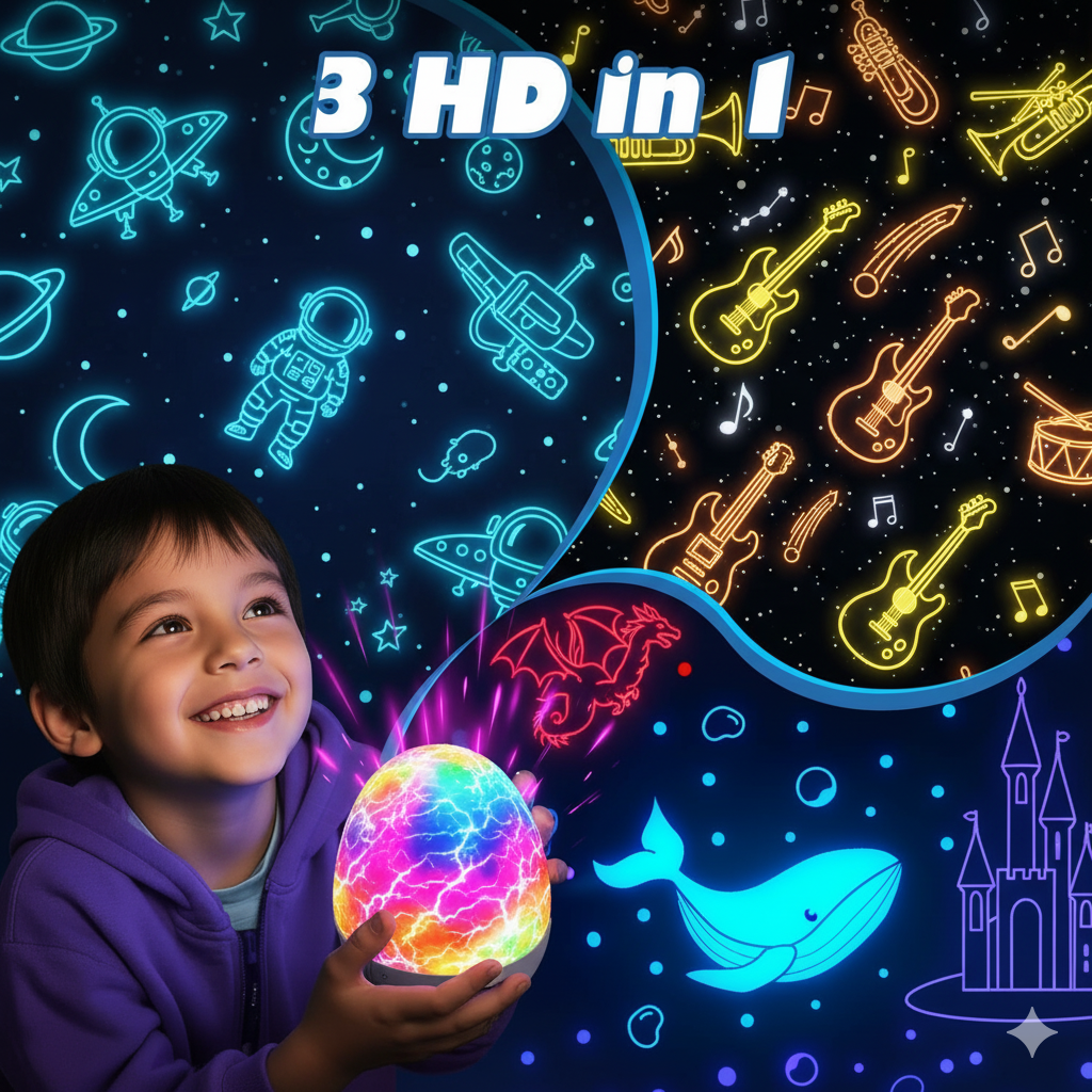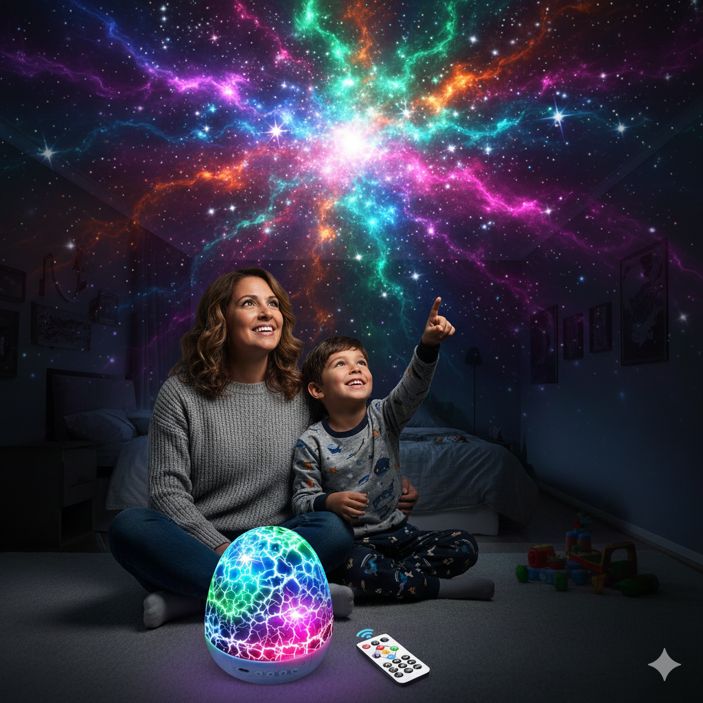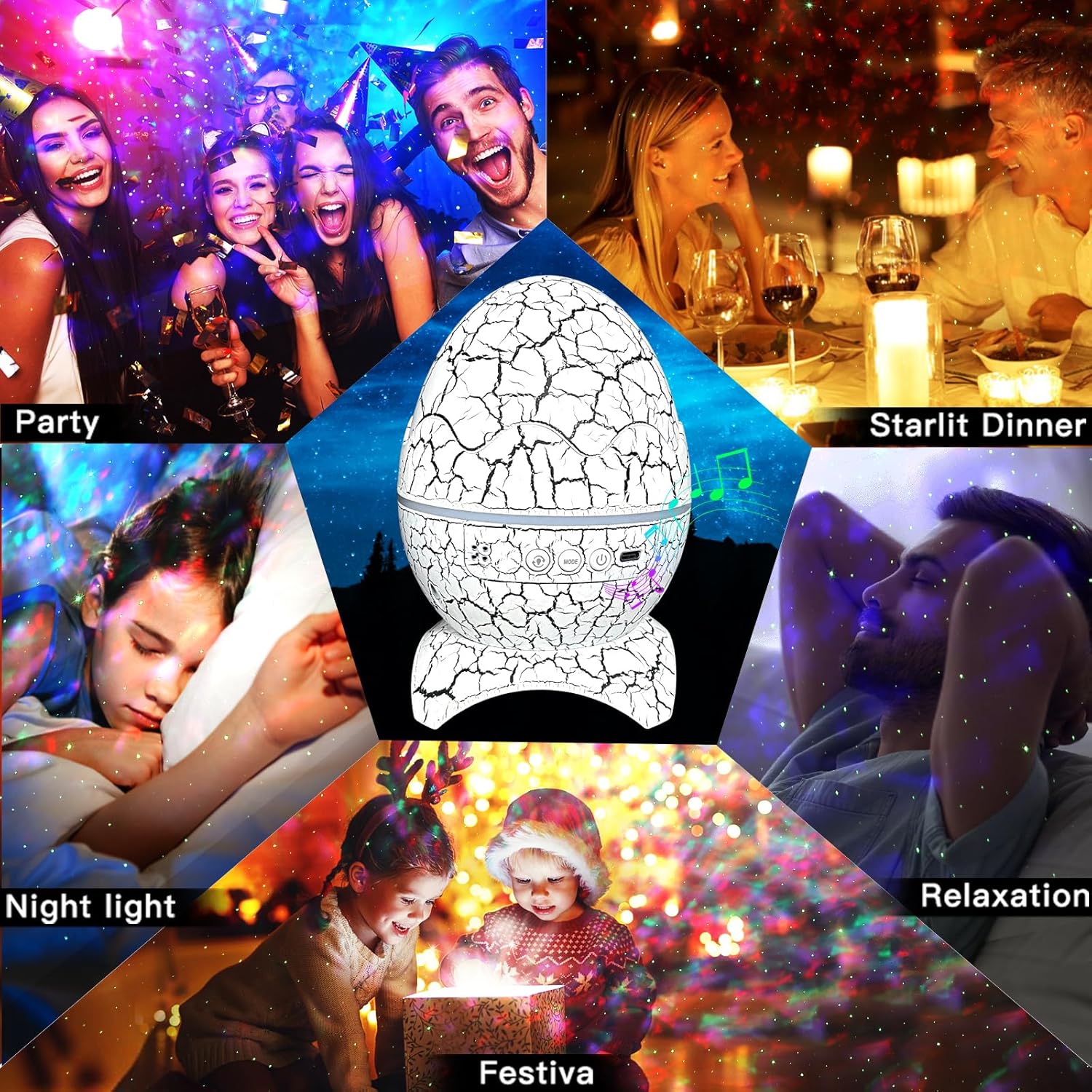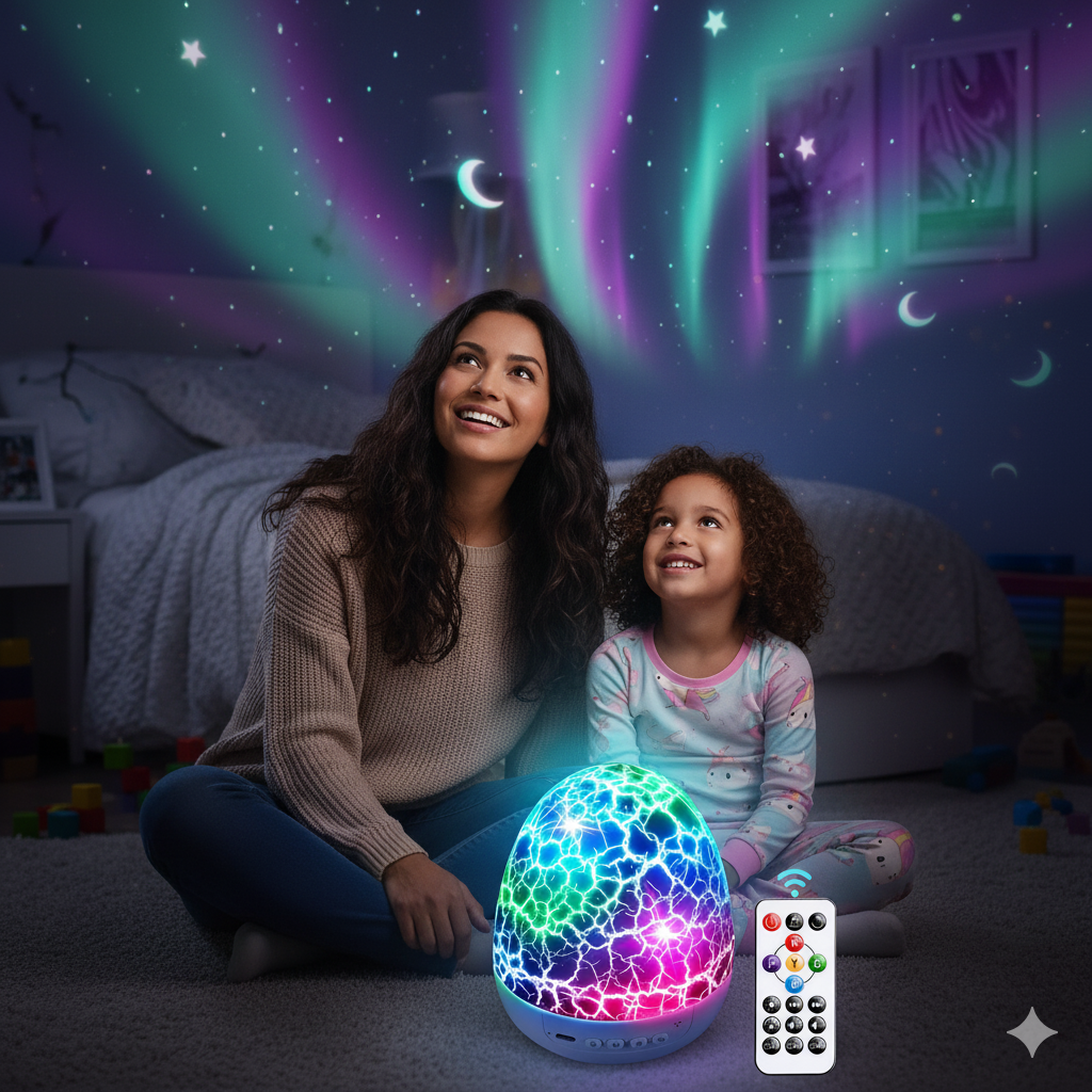 It’s a broken egg–shaped night light projector that can be used both as a soft night lamp and a rotating projector. It projects colorful patterns like dinosaurs, stars, or mermaids onto walls and ceilings to create a magical bedtime environment.