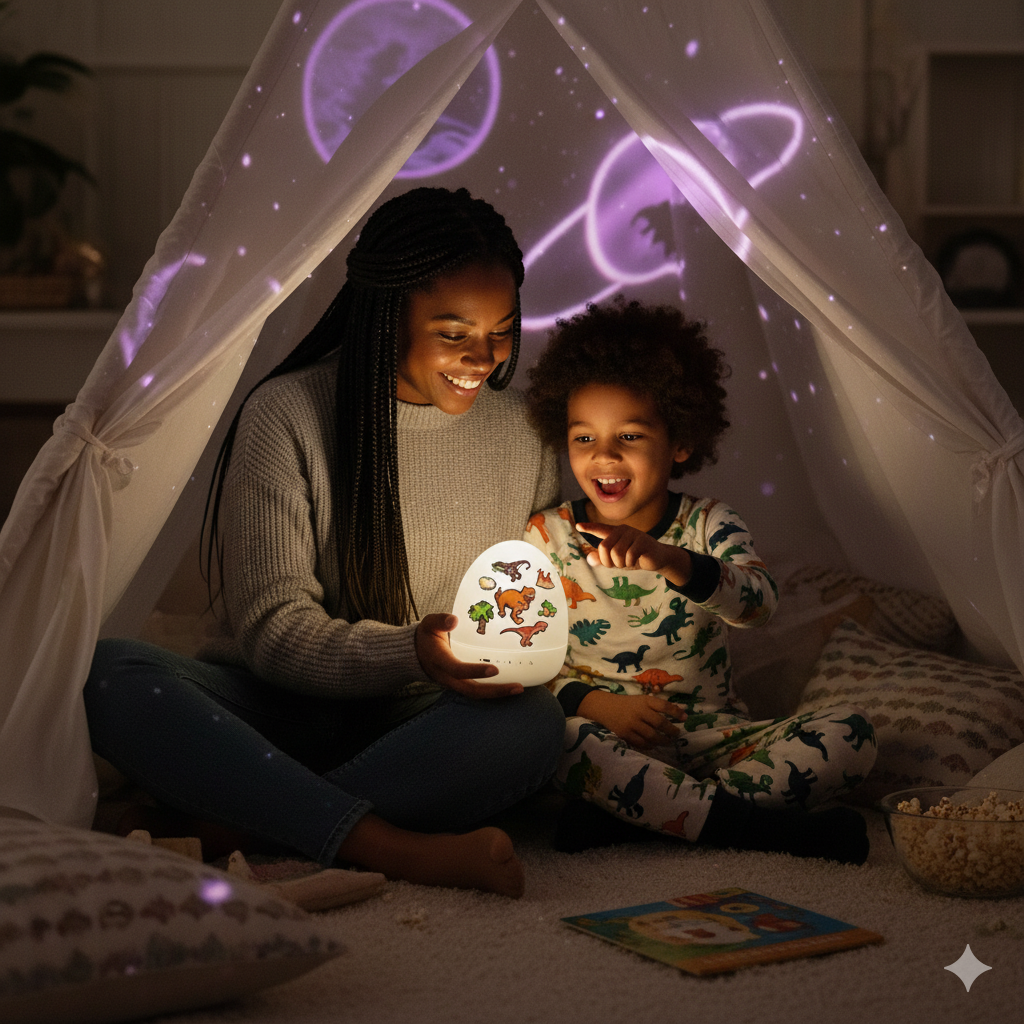 I love that it can be both a soft night light and a projector. The dinosaur egg design is adorable — kids love pressing the button to switch colors!