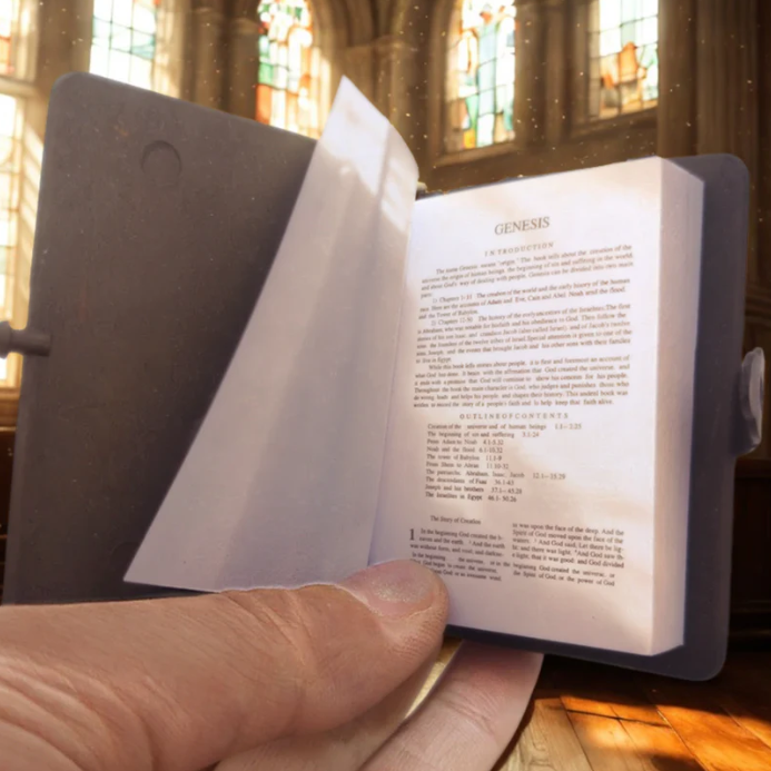 It’s a real, readable English Bible. Though mini in size, the pages contain scripture you can actually open and read.