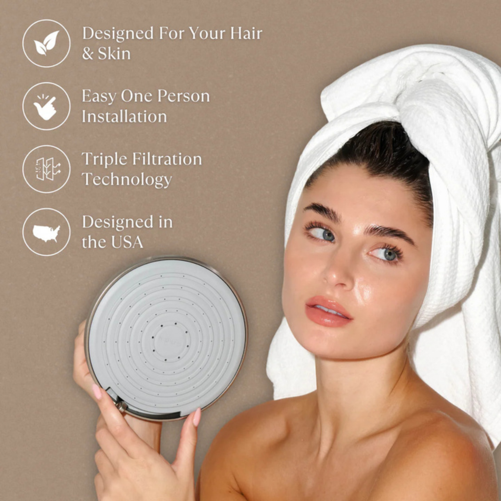 The NO1 Filtered Showerhead removes up to 99% of chlorine, heavy metals, and other irritants using a triple-filtration system (KDF-55, calcium sulfite, coconut carbon), transforming tap water into a gentle, nourishing flow. The result? Reduced hair breakage, less dandruff, calmer skin, fewer blemishes, and visibly healthier, stronger hair and complexion. Easy to install in just minutes, it’s a simple upgrade that protects your skin and hair at every shower.