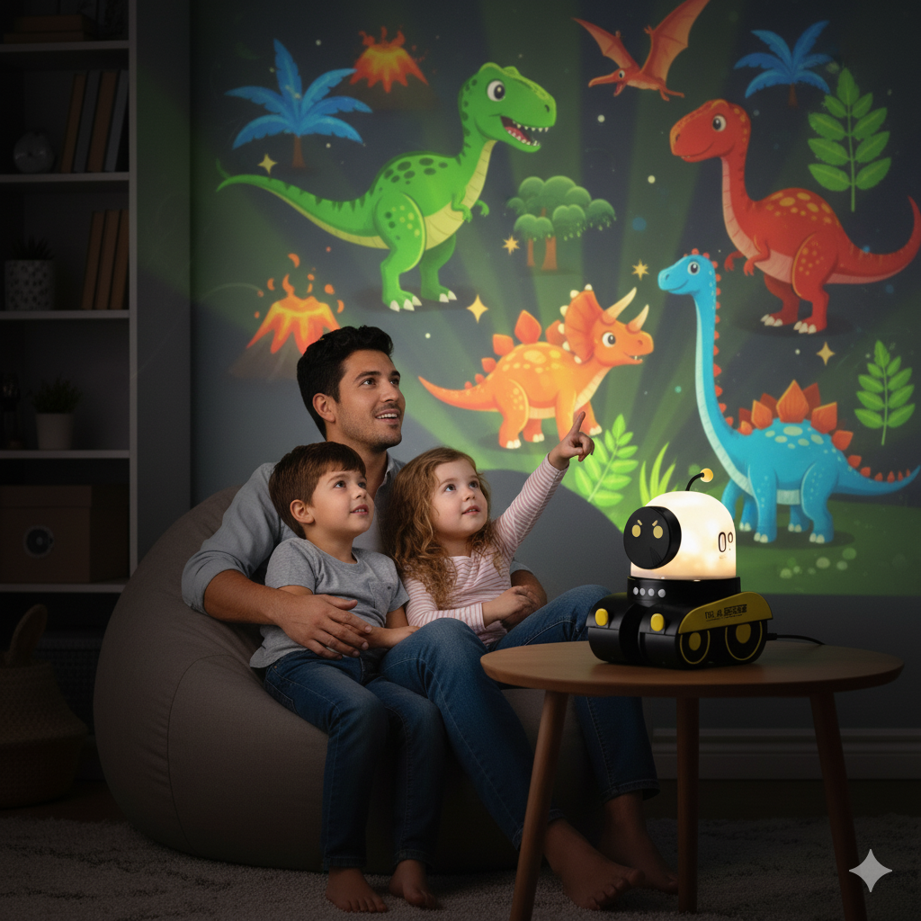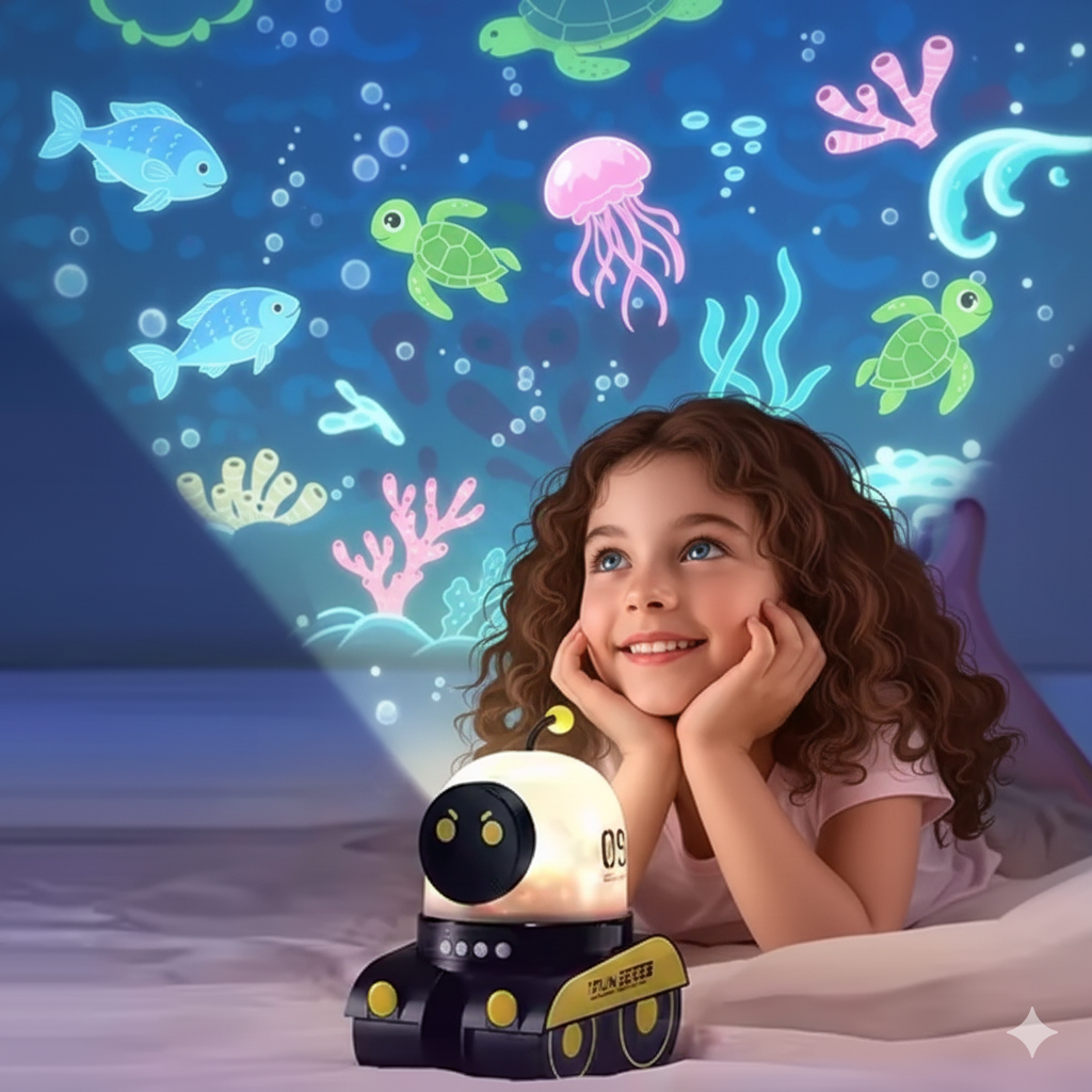 It’s a Robot Tank night light projector that can be used both as a soft night lamp and a rotating projector. It projects colorful patterns like dinosaurs, stars, or mermaids onto walls and ceilings to create a magical bedtime environment.