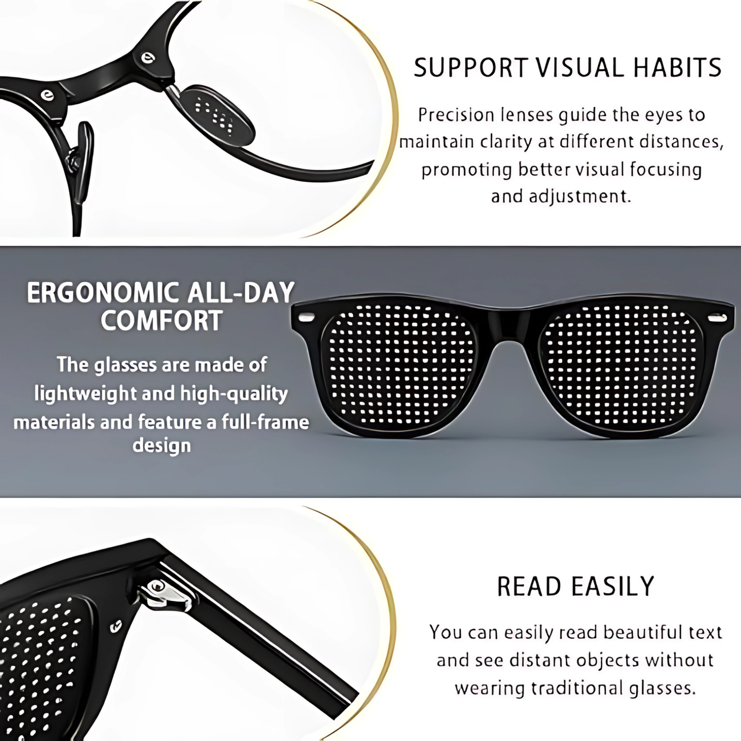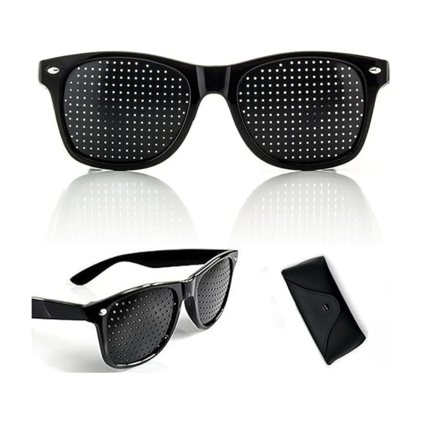 The pinhole design blocks scattered light and forces the eyes to focus through narrow points. This naturally stimulates the eye muscles, improves depth of focus, and can assist in reducing dependence on corrective lenses over time.
