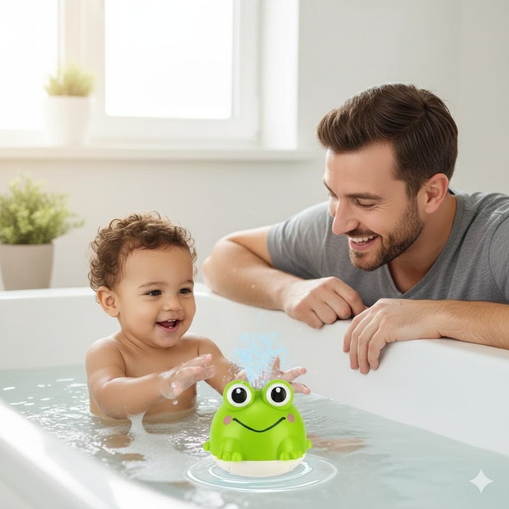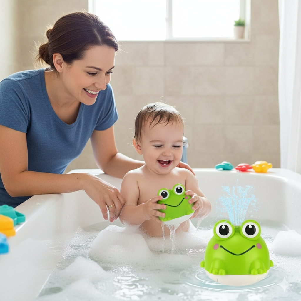 The toy activates automatically when placed in water, spraying gentle streams while flashing colorful LED lights that capture your baby’s attention.